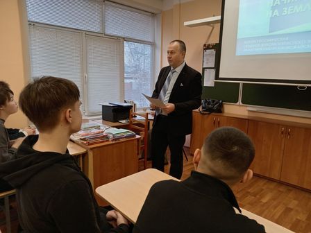 Также сегодня в рамках месячника оборонно-массовой и спортивной работы был проведён урок мужества. Перед обучающимися школы выступил полковник запаса, преподаватель военно-космической академии им. А. Ф. Можайского Воробьев Дмитрий Николаевич.