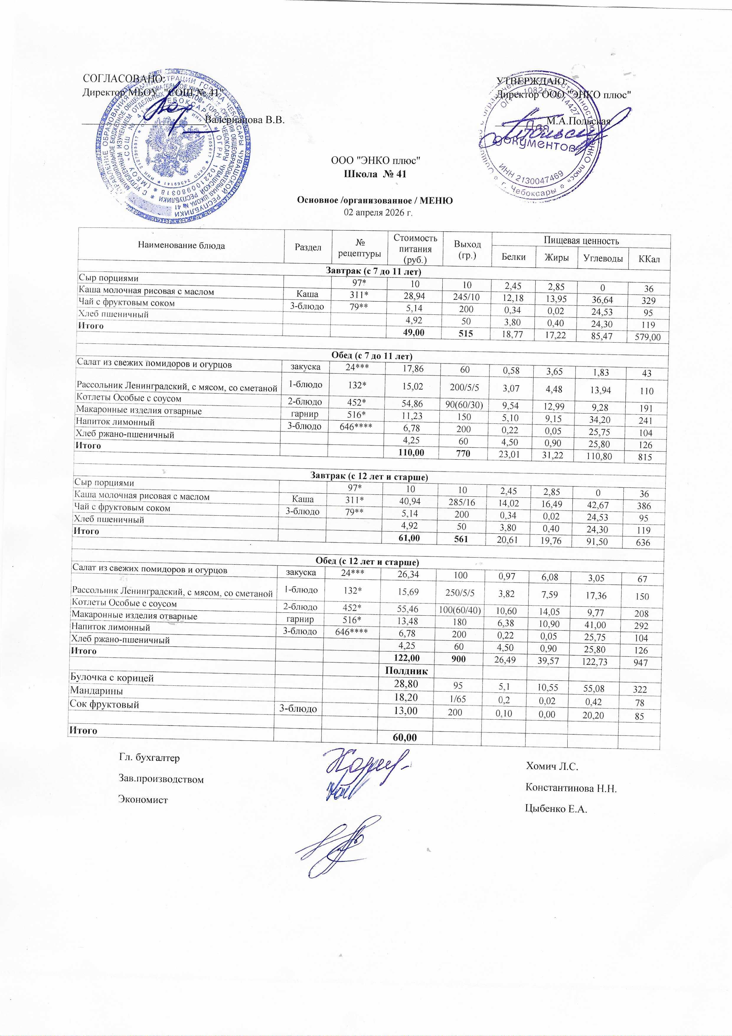 - Основное (организованное двухнедельное меню) для обучающихся общеобразовательных учреждений города Чебоксары, для возрастной категории 7—11 лет