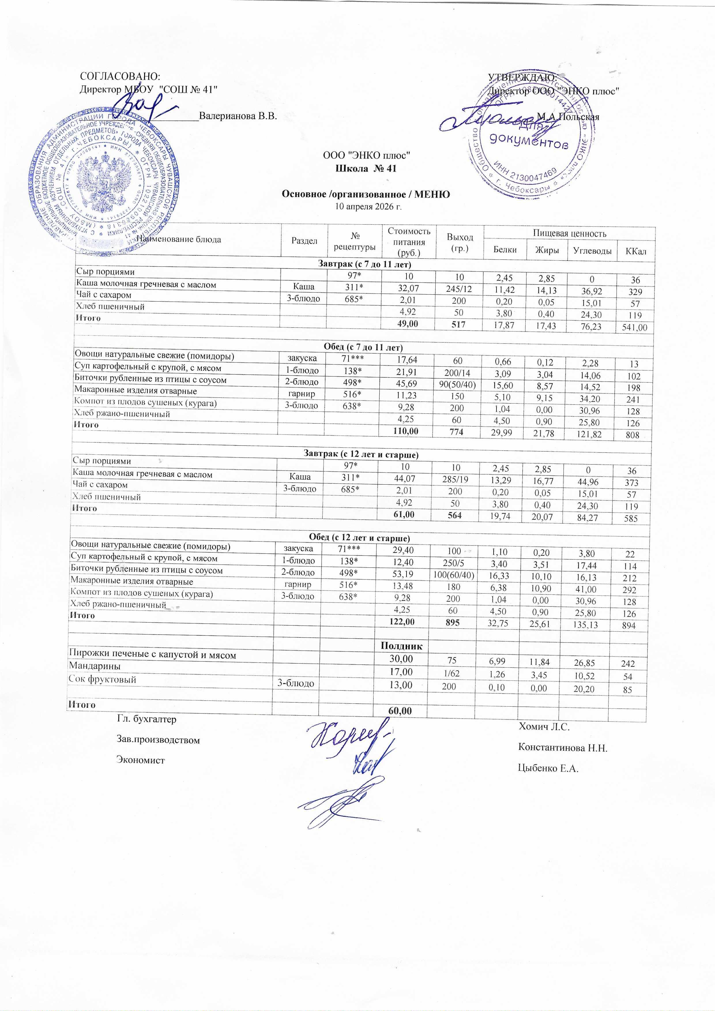 - Основное (организованное двухнедельное меню) для обучающихся общеобразовательных учреждений города Чебоксары, для возрастной категории 7—11 лет