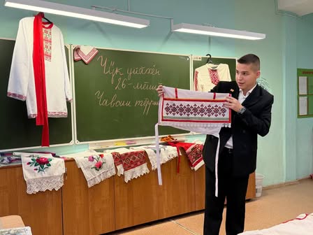 25 ноября прошла республиканская акция «На работу и учёбу с вышивкой», приуроченная ко Дню чувашской вышивки. В рамках этой акции учитель истории Павлов Никита Сергеевич провел патриотический урок мужества на тему «Моя малая Родина». Никита Сергеевич пришёл на работу в костюме с элементами чувашского орнамента, принёс образцы чувашской вышивки, одежду с национальным орнаментом. Во время урока мужества ученики ознакомились с обрядом «Проводы в армию», примерили чувашскую одежду, исполняли песни, знакомились с культурой чувашского народа. Также в этот день были проведены экскурсии по нашему школьному музею, в котором обучающиеся смогли ознакомиться с экспонатами, демонстрирующими культуру и обычаи чувашского народа.