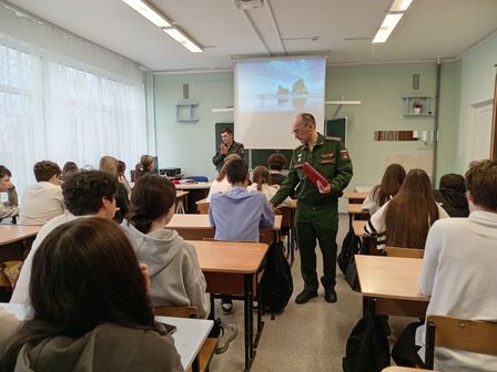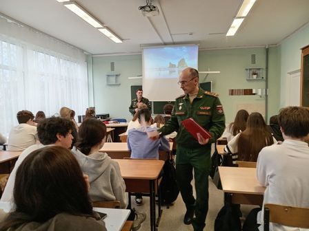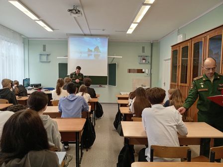 13 ноября для старшеклассников школы, будущих выпускников, прошёл урок мужества. Провести его для ребят пришли полковник медицинской службы 48 центрального научно-исследовательского института Министерства обороны РФ Петров Александр Анатольевич и капитан, научный сотрудник Целиков Евгений Михайлович. Они рассказали ребятам о героях Российской Федерации, поделились личными историями со службы и своей работы, а также обсудили то, какой вклад в развитие страны может внести каждый гражданин.